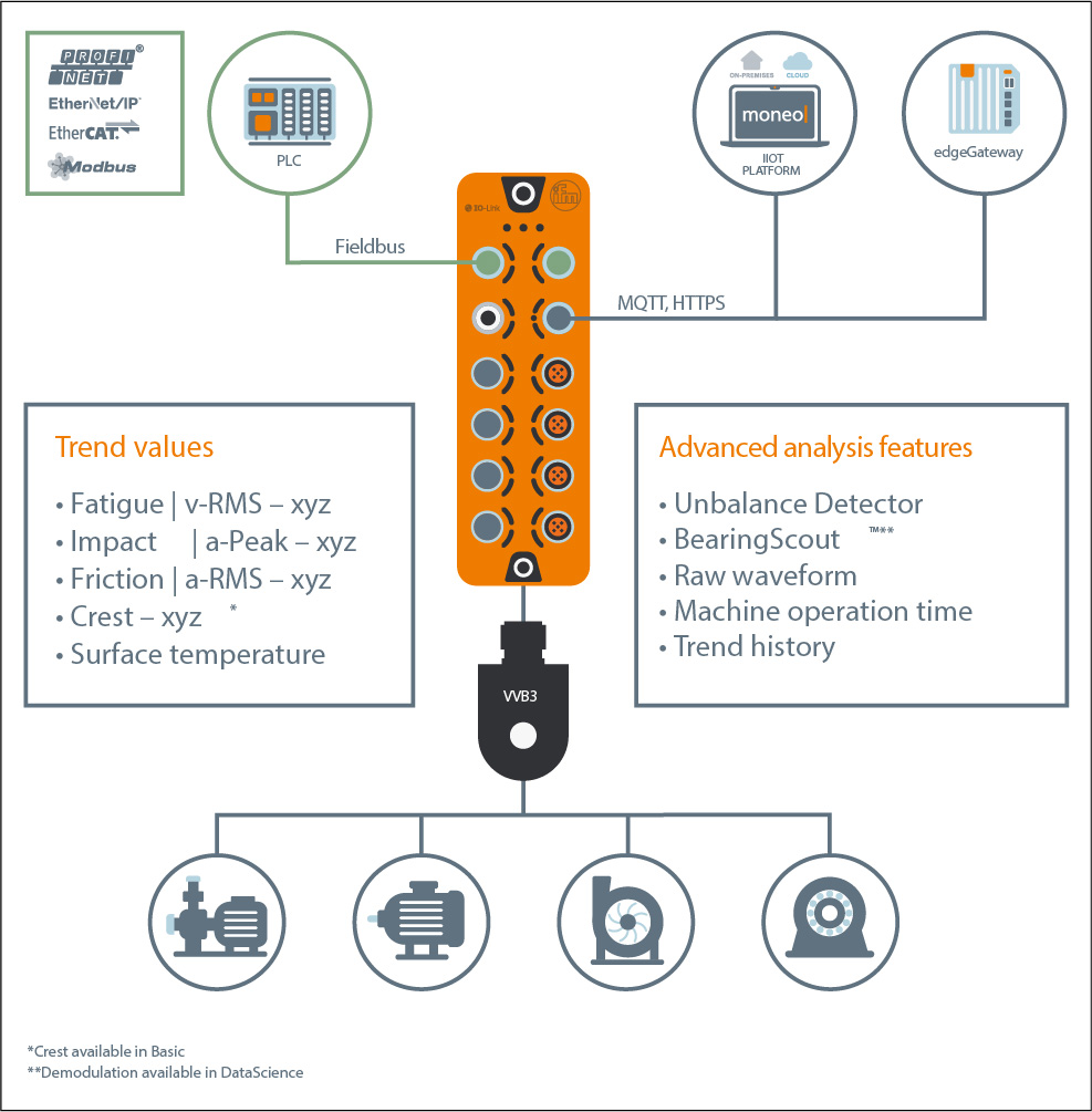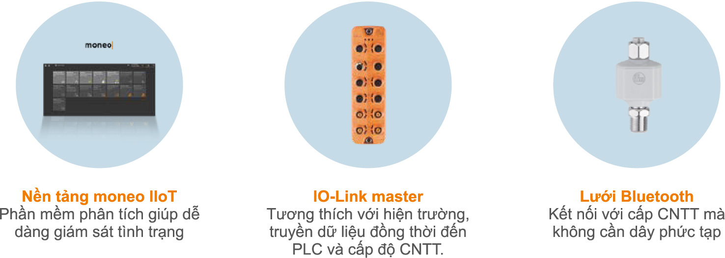 Tất cả dữ liệu được truyền đồng thời đến cả hệ thống điều khiển và cấp độ CNTT thông qua IO-Link, để người dùng có tất cả các chỉ số liên quan cho việc giám sát tình trạng dựa trên CNTT, ví dụ như trong nền tảng moneo IIoT.