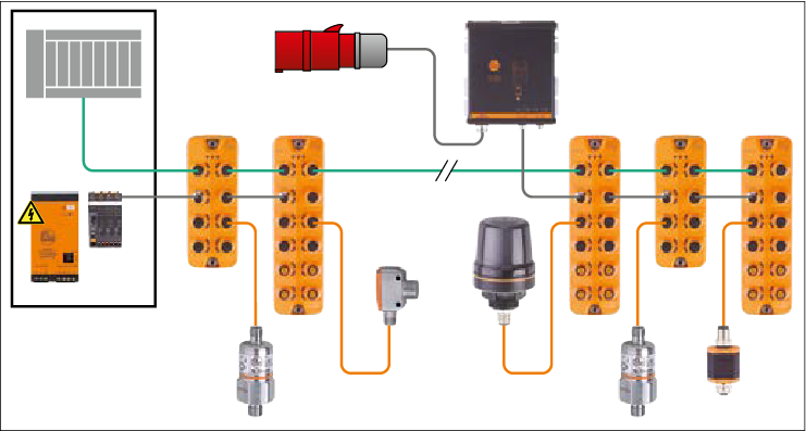 | Nguồn cấp điện trực tiếp tại hiện trường – Nguồn cấp điện 24 V Ngày càng nhiều người dùng gắn các thành phần điều khiển phi tập trung ở máy thay vì tủ điều khiển, ví dụ như IO-Link master hoặc các mô-đun hiện trường khác. Với nguồn cấp điện cổ điển từ tủ điều khiển, tình trạng sụt áp nghiêm trọng sẽ xảy ra do dòng điện cao chạy qua các dây cáp dài. Để tránh tình trạng này, ifm giới thiệu nguồn cấp điện mạnh mẽ để gắn lắp trực tiếp tại hiện trường. Bảo vệ mạch thứ cấp – Nguồn cấp điện 24 V Cầu chì điện tử tích hợp bảo vệ hiệu quả các thành phần được kết nối với nguồn điện 24 V chống lại tình trạng quá dòng và đoản mạch.