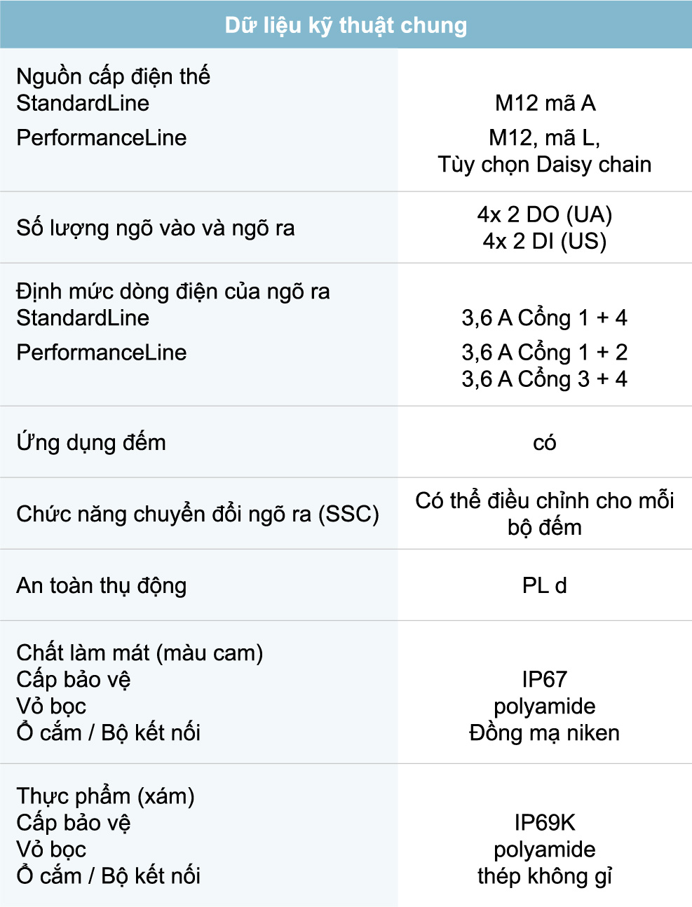 Đối với nguồn cấp, các mô-đun PerformanceLine sử dụng kết nối M12 mã L với dòng điện định mức 2x16A. Nhờ vậy cho phép kết nối kiểu Daisy-chain. Các mô-đun StandardLine cung cấp kết nối M12 mã A với dòng điện định mức 3,9 A (tiêu chuẩn Mỹ) và 4 A (tiêu chuẩn quốc tế)